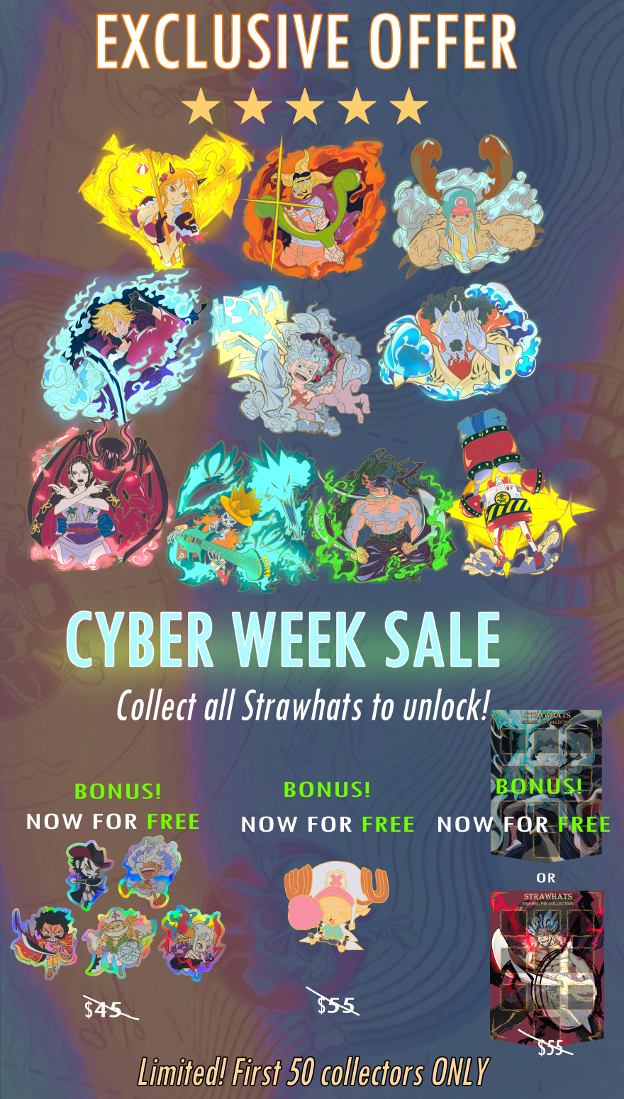 Buy now to secure the complete set with your choice of 1 of 2 bonus display banners ($55), Holographic Sticker Set ($45) and Cotton Candy Chopper Pin ($55) all for FREE. Available for a very limited time only to the first 50 Full Strawhat Collectors!